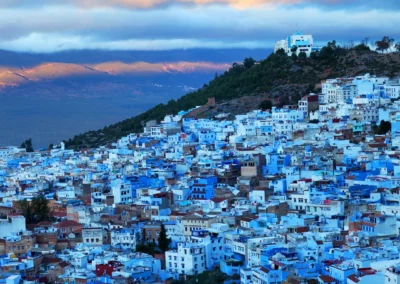 Travel northwest toward the picturesque town of Chefchaouen, famous for its striking blue-painted streets. Enjoy panoramic views from a lookout point before descending into the medina to wander its quaint alleys. Overnight in Chefchaouen.