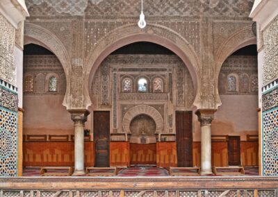 Wake up early to witness a breathtaking sunrise over the Sahara dunes. After breakfast and freshening up, ride back by camel to Merzouga town. Begin your journey toward Fes via Errachidia, passing Erfoud, Aoufous, and the scenic Ziz Valley with a stop for panoramic views.